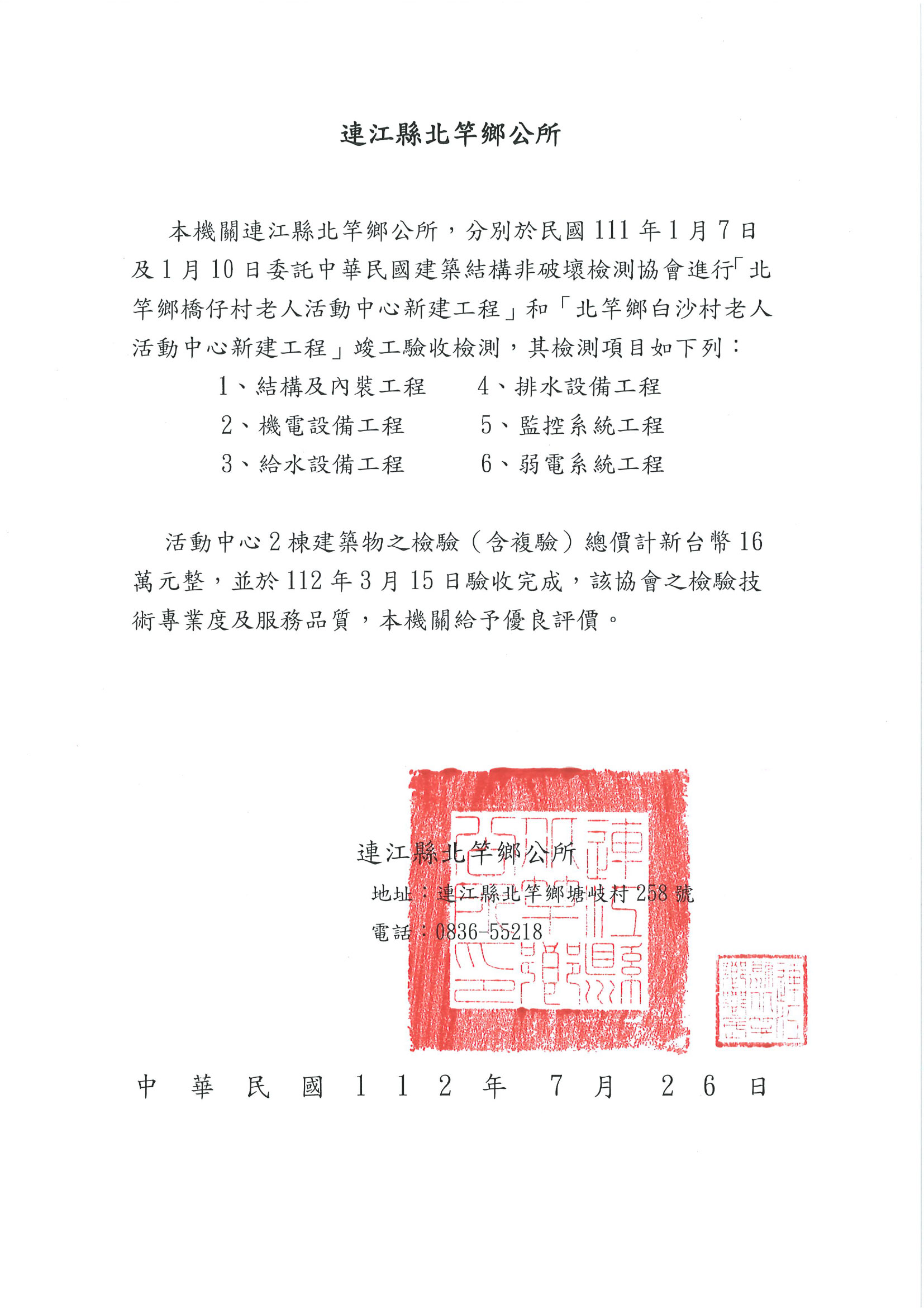 承攬–馬祖連江縣政府藝文中心竣工驗收獲頒感謝狀 承攬–臺北市政府廣慈博愛社會住宅第三方驗屋 承攬–臺北市政府福星社會住宅第三方驗屋 承攬–臺北市政府莒光社會住宅第三方驗屋 承攬–立邦建設公司成家大樓住宅第三方驗屋 承攬–金弘建設日光天晴大樓住宅第三方驗屋 承攬–鴻譽建設公司日月墅透天別墅第三方驗屋 承攬–馬祖連江縣北竿鄉公所橋仔活動中心竣工驗收 承攬–馬祖連江縣北竿鄉公所白沙活動中心竣工驗收 承攬–馬祖連江縣北竿鄉公所納骨塔竣工驗收 承攬–新和生物科技股份有限公司銅鑼廠竣工驗收 承攬–三大未來科技股份有限公司屏東廠竣工驗收 承攬–遠雄建設公司文青大樓第三方驗屋 承攬–方富五金廠份有限公司新廠竣工驗收 承攬–東陽精機廠房火災災害鑑定 承攬–高雄京城大樓公共設備點交驗收