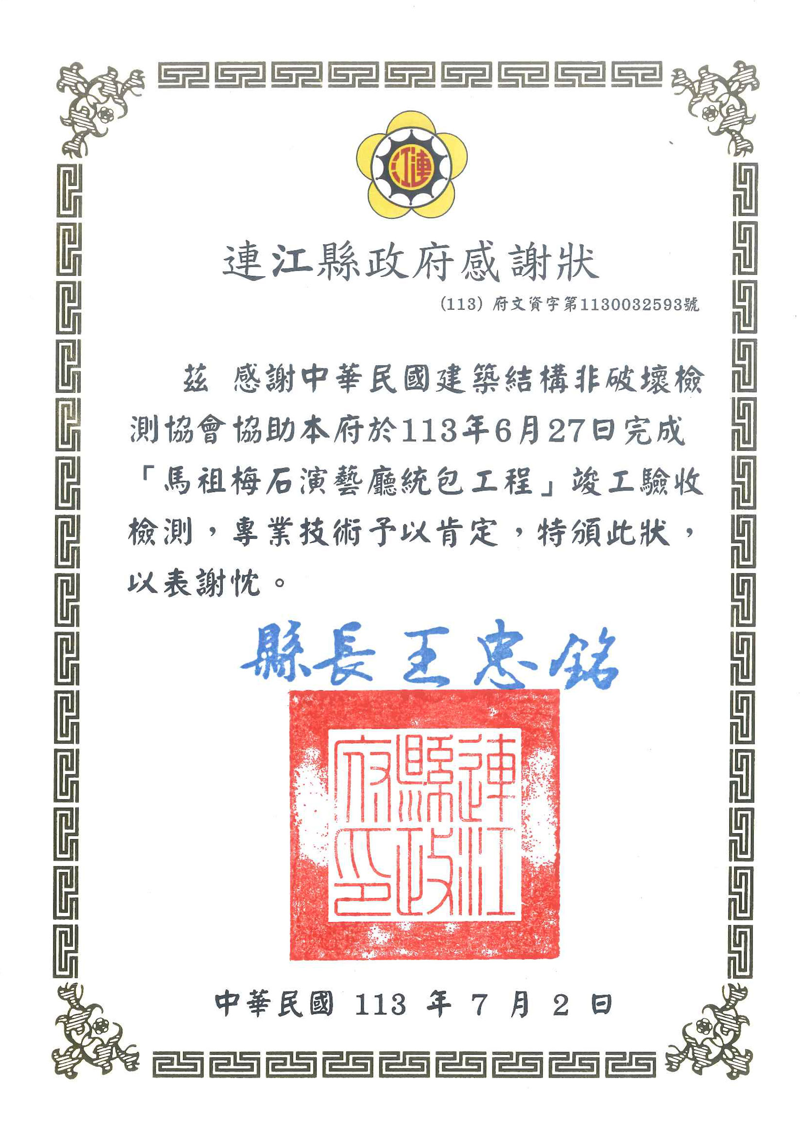 馬祖連江縣政府感謝狀