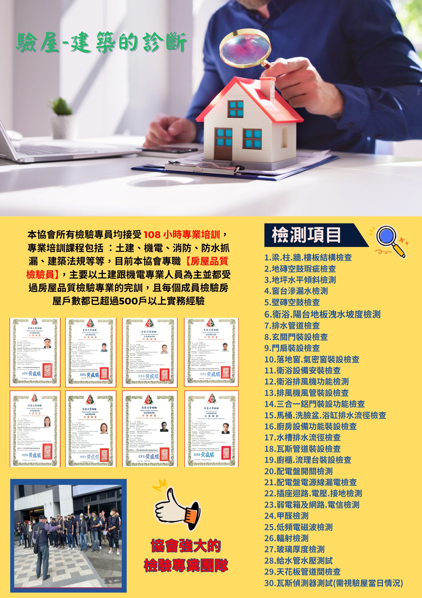 地坪水平檢測,房屋檢驗結構瑕疵檢測,衛浴設備檢查,廚房設備檢查,電氣迴路安全檢查,牆面漏水滲水檢測,牆面壁癌檢測,輻射鋼筋檢測,海砂屋氯離子檢測,房屋傾斜檢測,門窗防水漏水檢測等。一般中古屋都以【現況交屋】完成點交,這對買方是一個不定時炸彈,如未詳細檢測屋況,交屋後才發現屋況缺失連連,輕則油漆脫落或滲水導致壁癌狀況,屋,海砂屋,房屋傾斜,混凝土中性化等等,雖然買方可以依據民法35條第一項以買受物賣方未告知重大瑕疵,提起訴訟請求賣方賠償或解約,房屋檢驗絕對是有必要的。